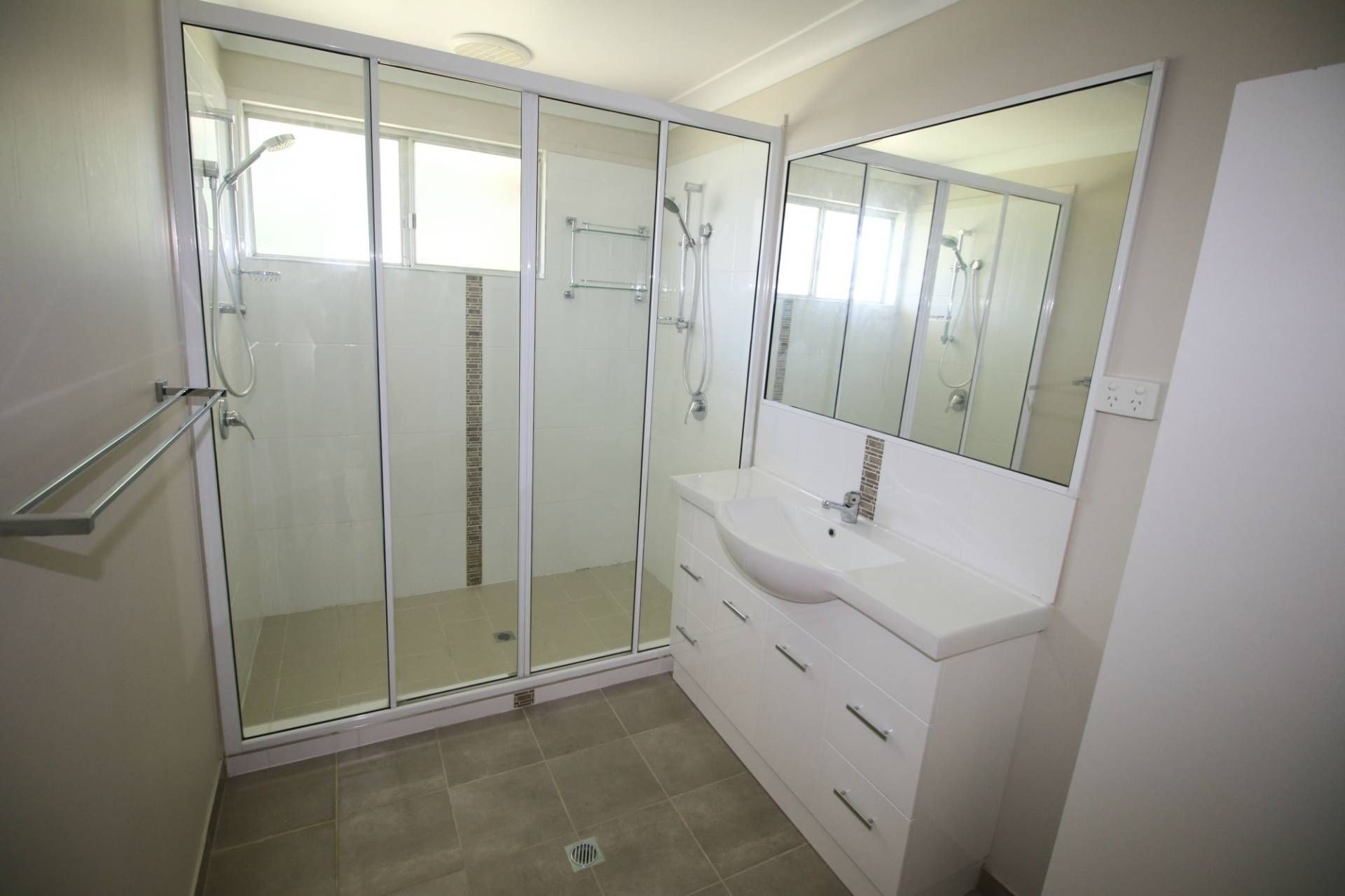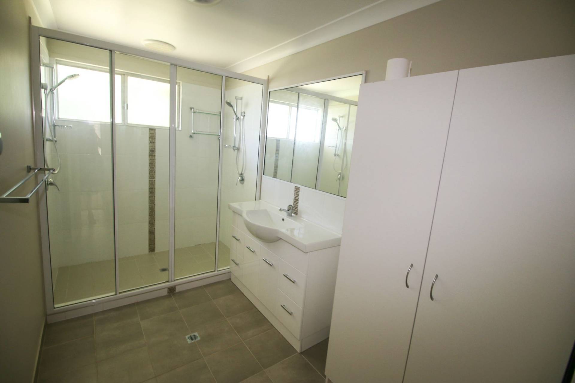 The bathroom has been renovated fully with lovely light tones, stunning double shower, big vanity and storage cupboard. You’ll find the kitchen also great, plenty of cupboards plus dining area beyond.