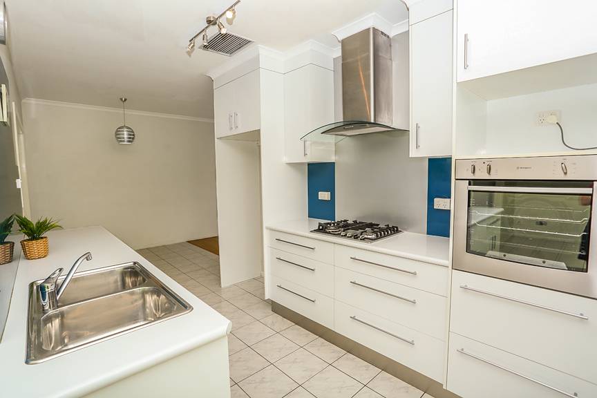Funky modern kitchen with gorgeous feature splash back, gas cooking, deep draws for storage and plenty of bench space