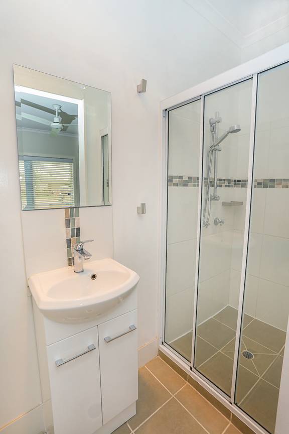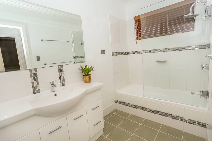A stylish main bathroom with shower over tub facility, separate toilet plus internal laundry