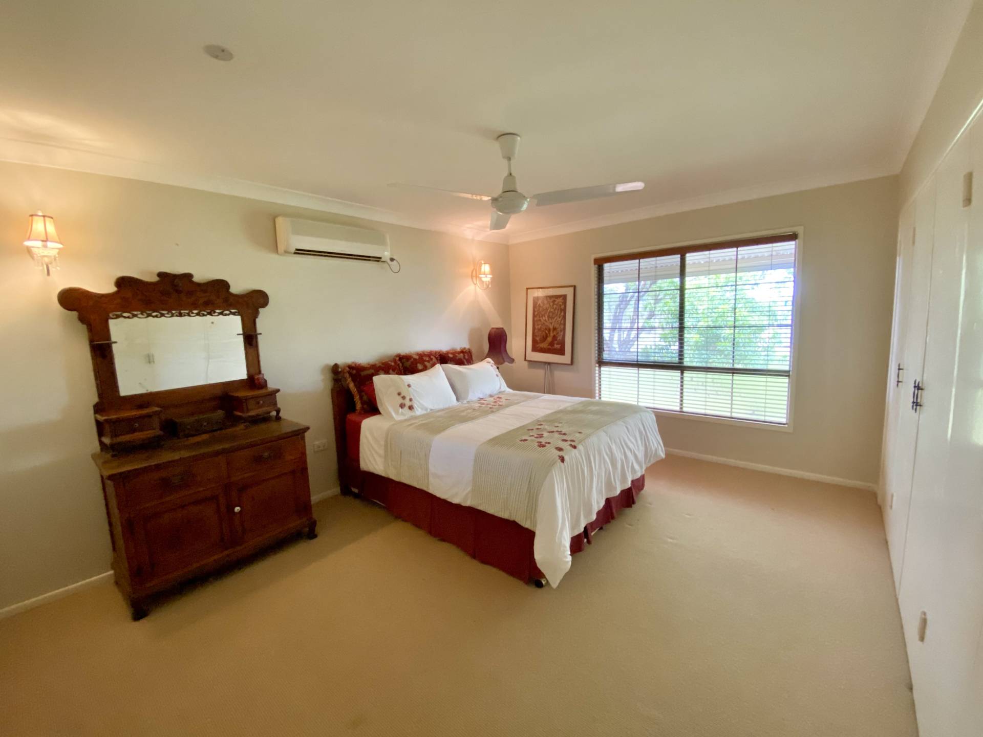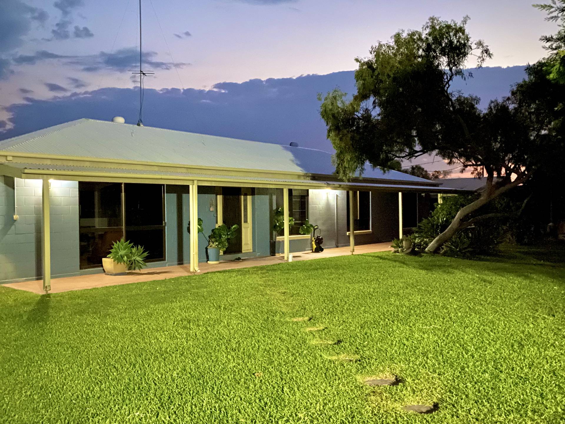 • Heat-resistant brick exterior, insulated ducted roofing and reflective roof coating. The inside is cooled by split systems, while the front lawn features mature, shady trees.