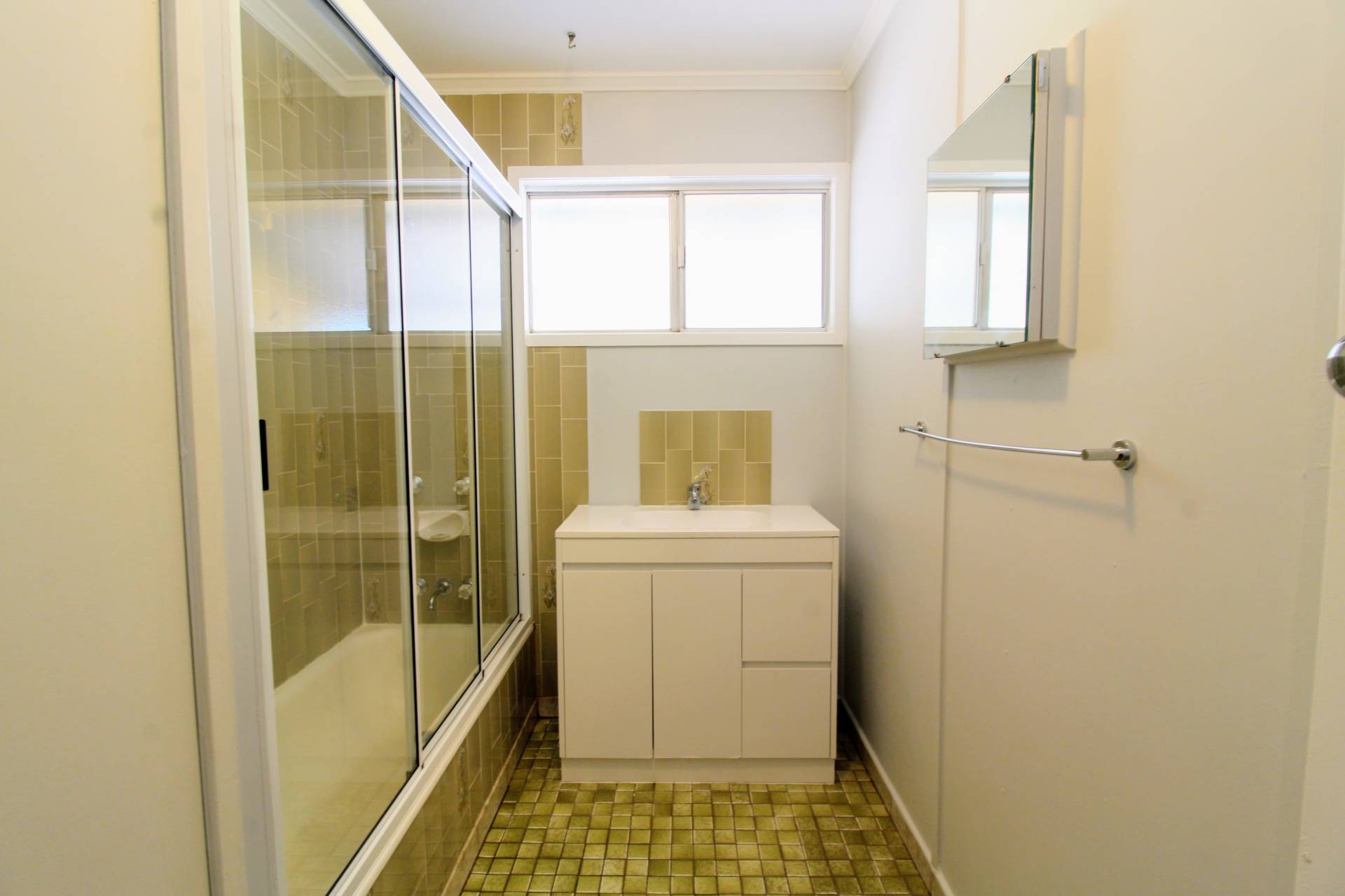 - Bathroom features screened shower over bath configuration