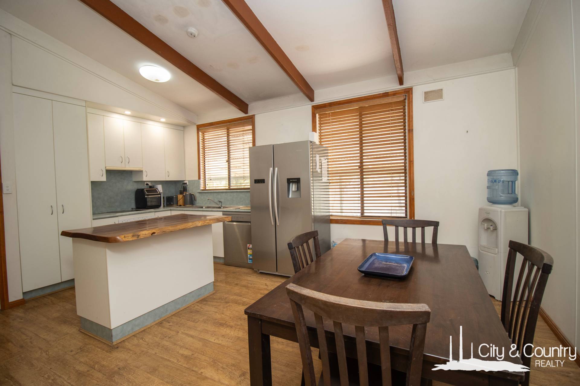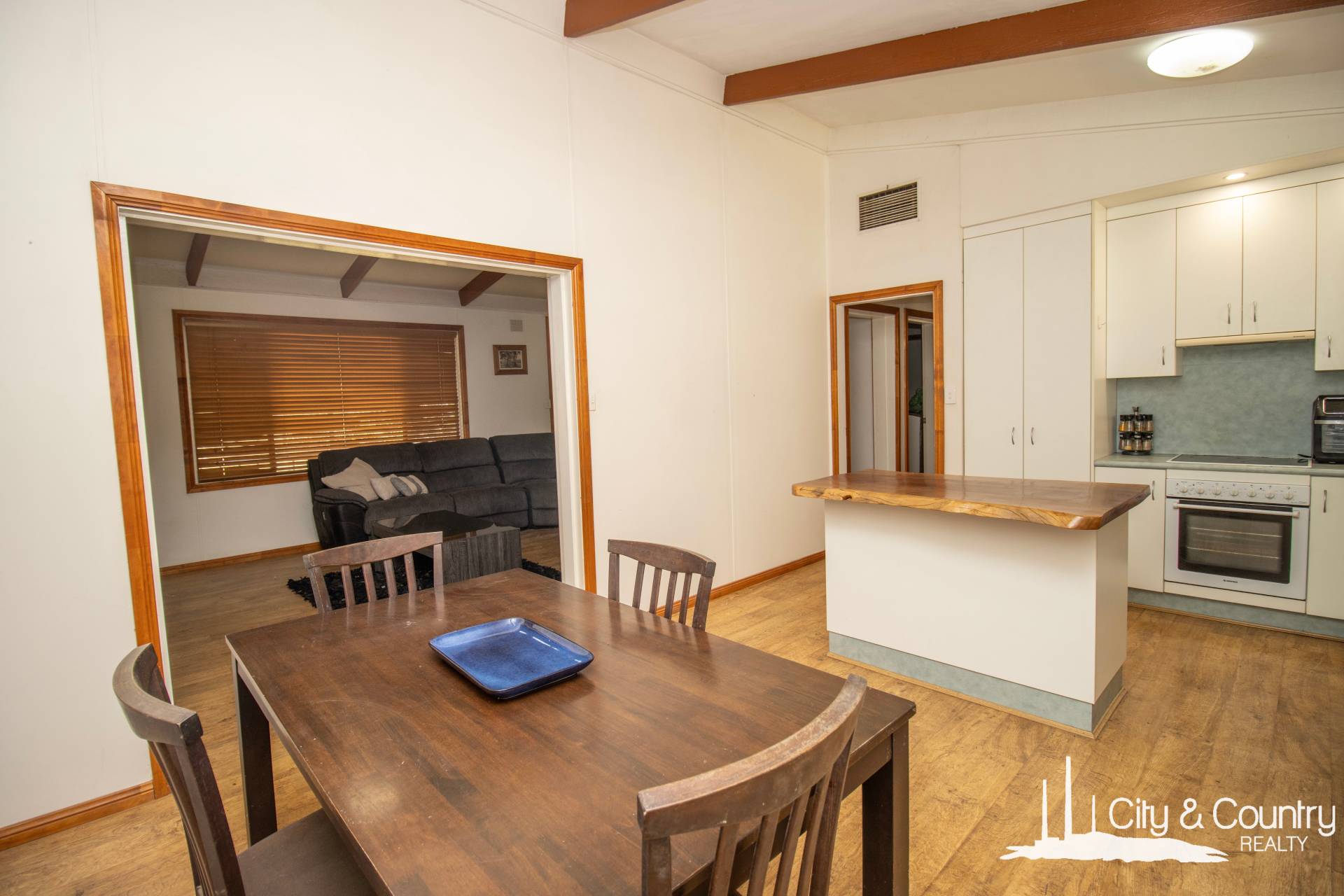 The living spaces inside feature tall, raked ceilings and a great size lounge area, floating floors and views of the lawns and gardens. Spacious country kitchen with a timber-top island bench and enough space for a comfortable dining area.