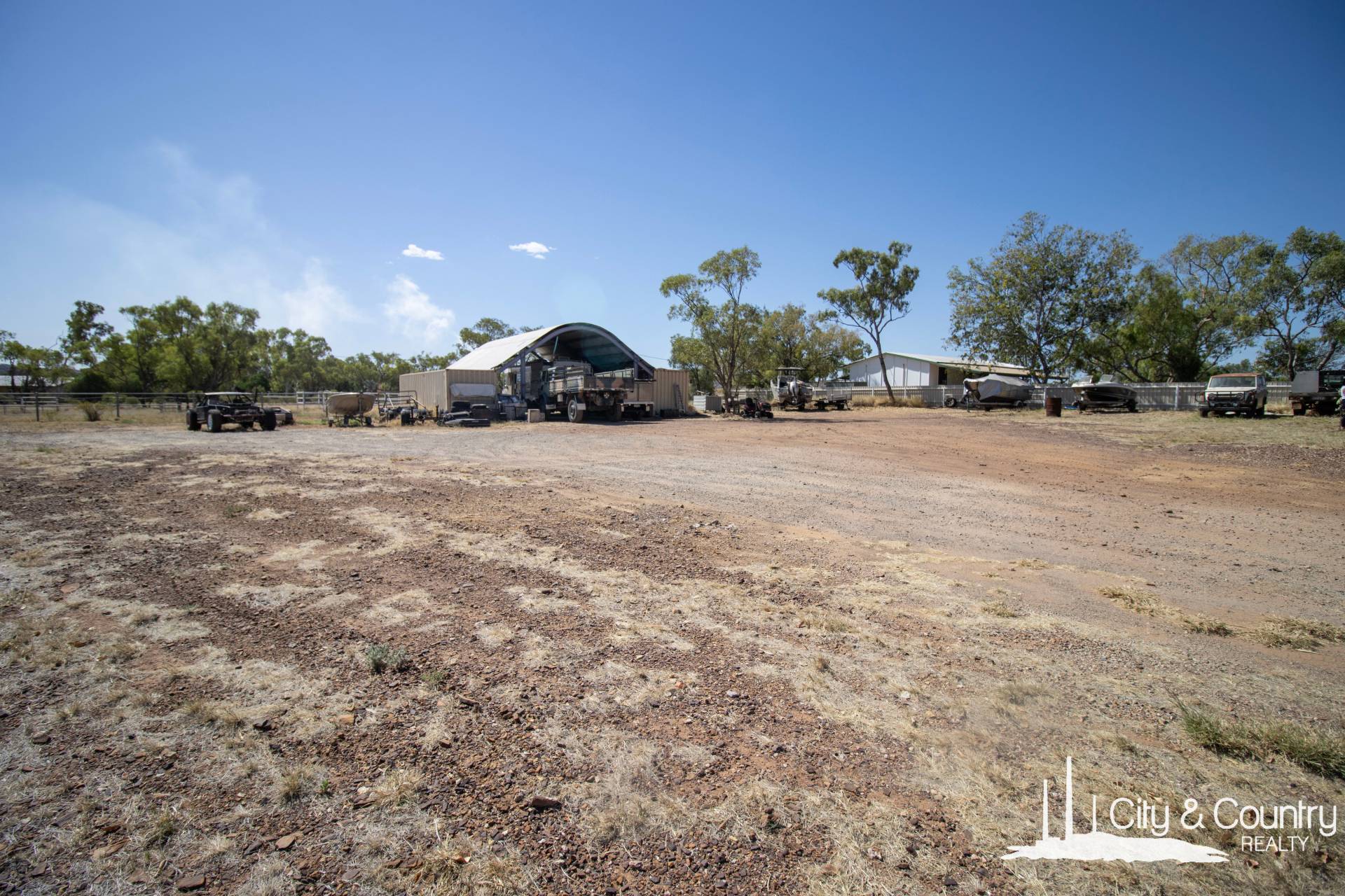 In the large, graveled yard, a drive through workshop with fully cemented floors, covered by a high dome to let the breezes through. The roof is supported by two 40ft containers for secure storage options.