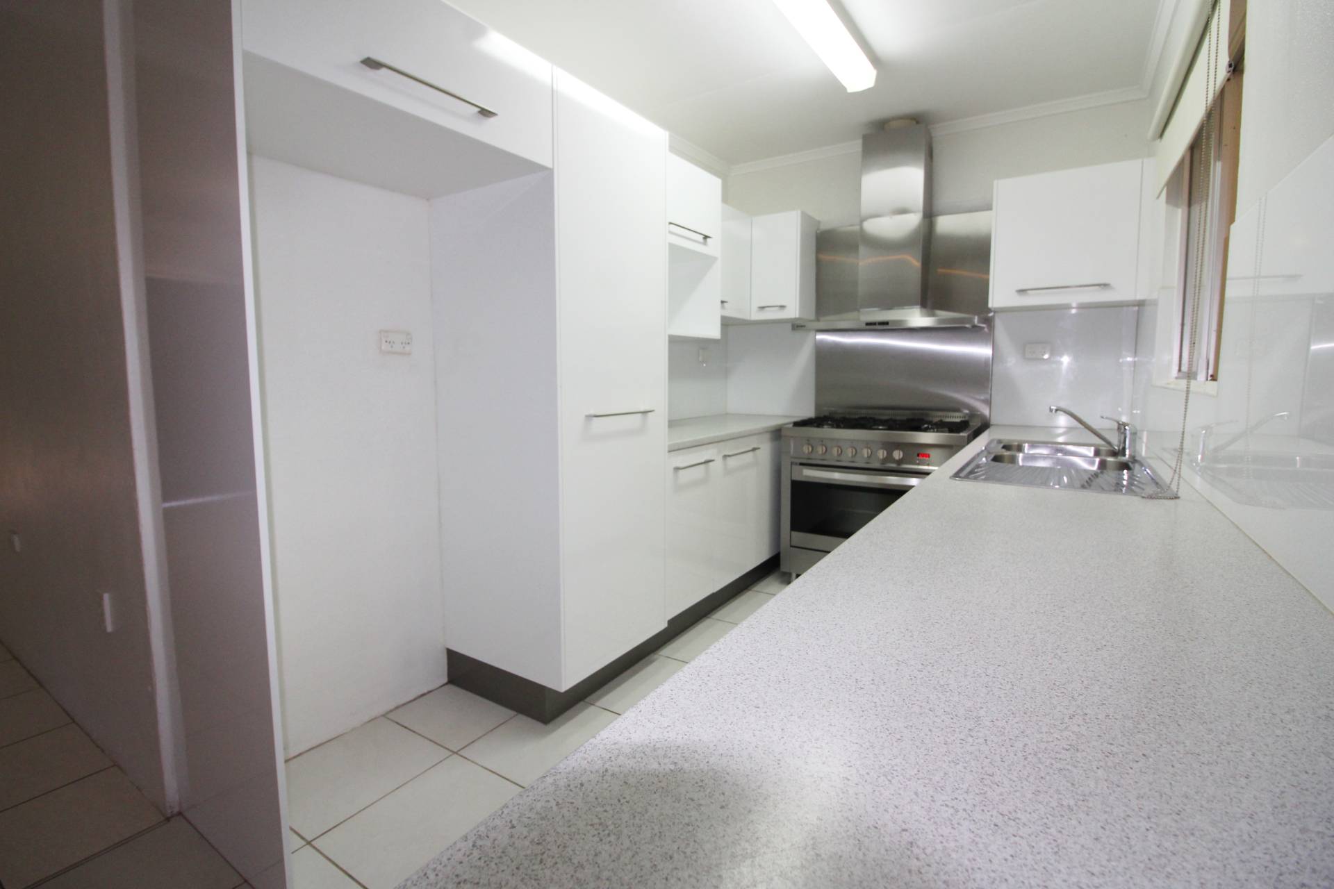 Walk into the large tiled living area that follows into the modern kitchen with a industrial size gas stove and oven.