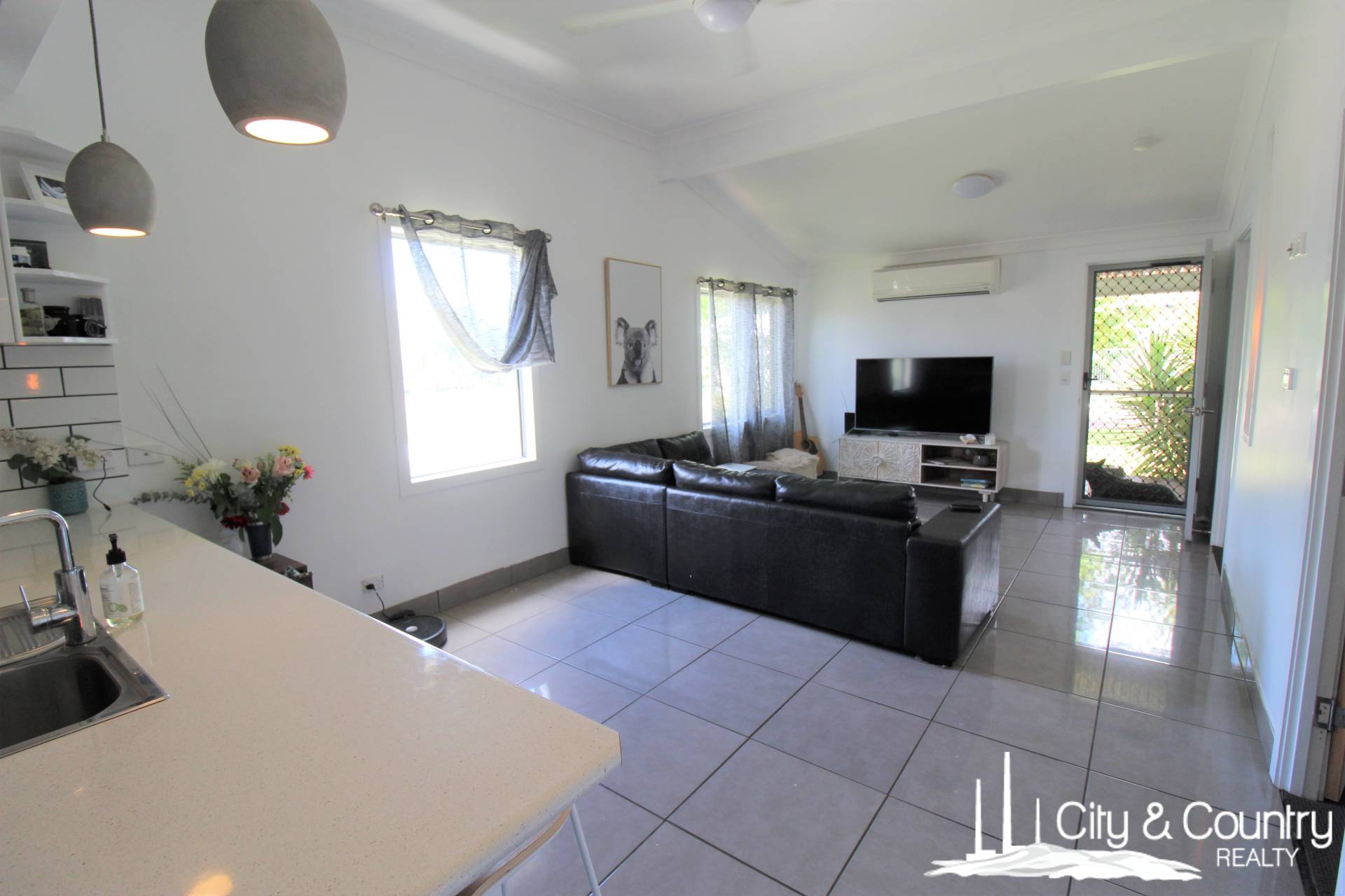 Step inside to discover a fully tiled, open-plan lounge area complete with split-system air conditioning, ensuring year-round comfort. The stylish, modern kitchen is a chef’s delight, thoughtfully positioned just off the lounge. It features a breakfast bar, dishwasher, gas cooktop with rangehood, stainless steel sink, and ample cupboard and bench space.