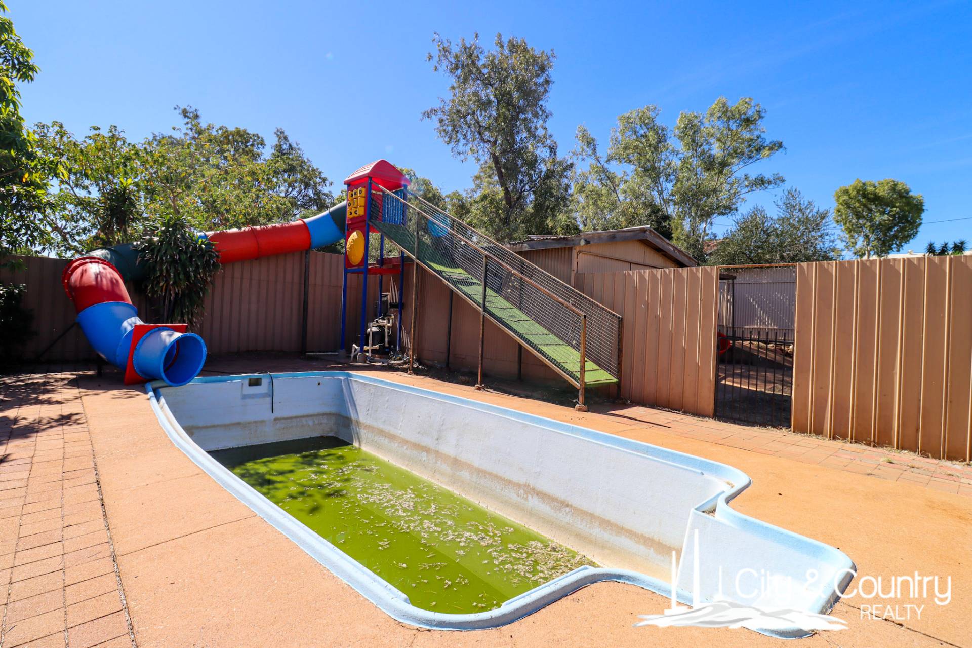 Outdoors, the spacious backyard boasts an entertainment area, shed, and an inground pool complete with a slide.