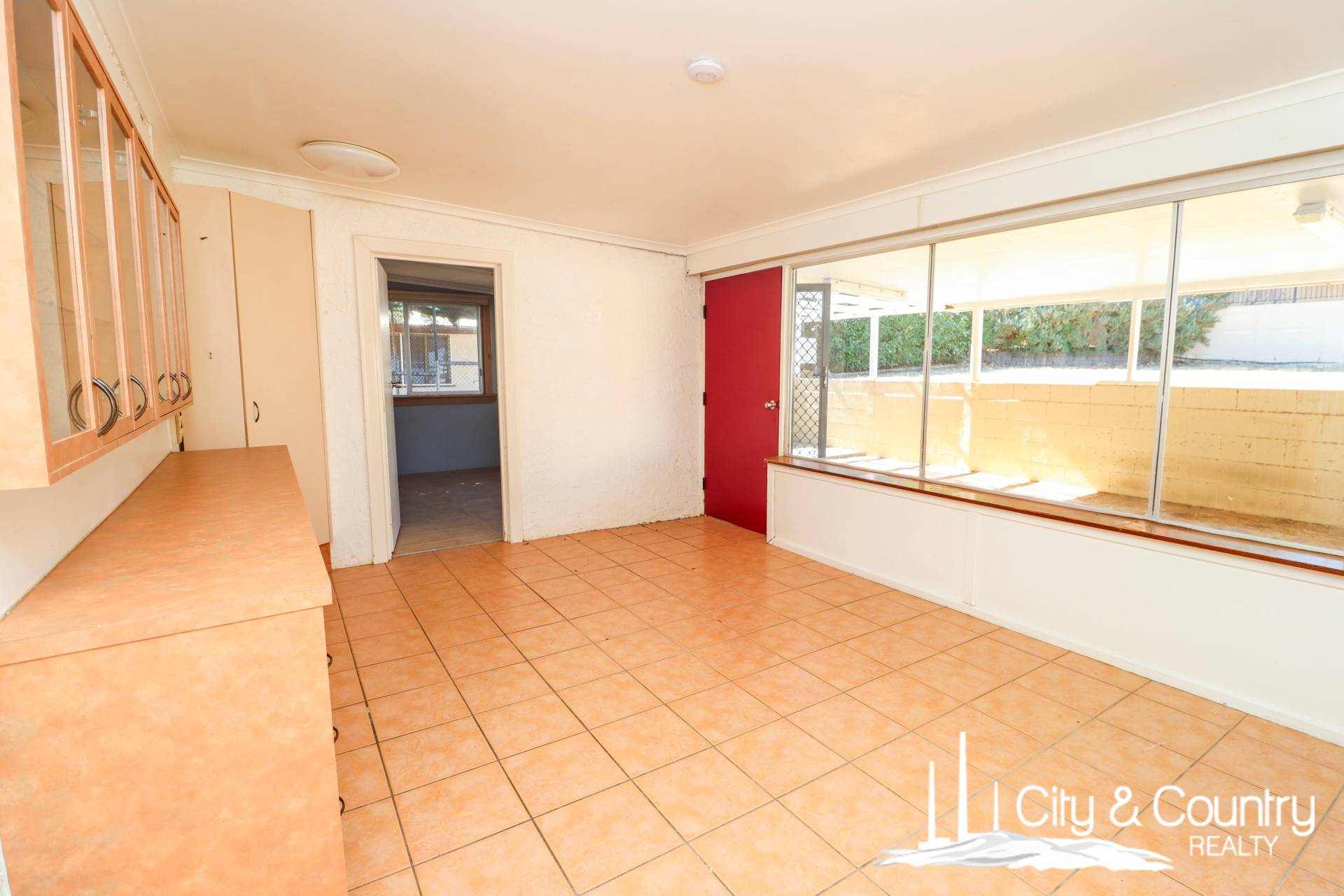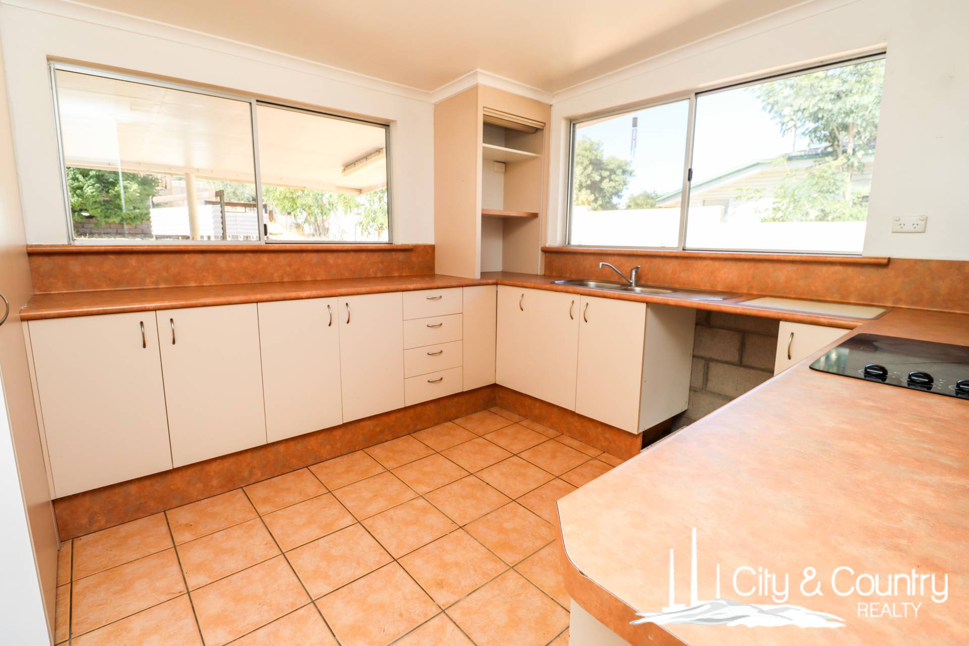 The bright kitchen is filled with natural light and offers electric cooking, plenty of shelving, cupboard space, and generous bench areas — a great foundation for future updates.