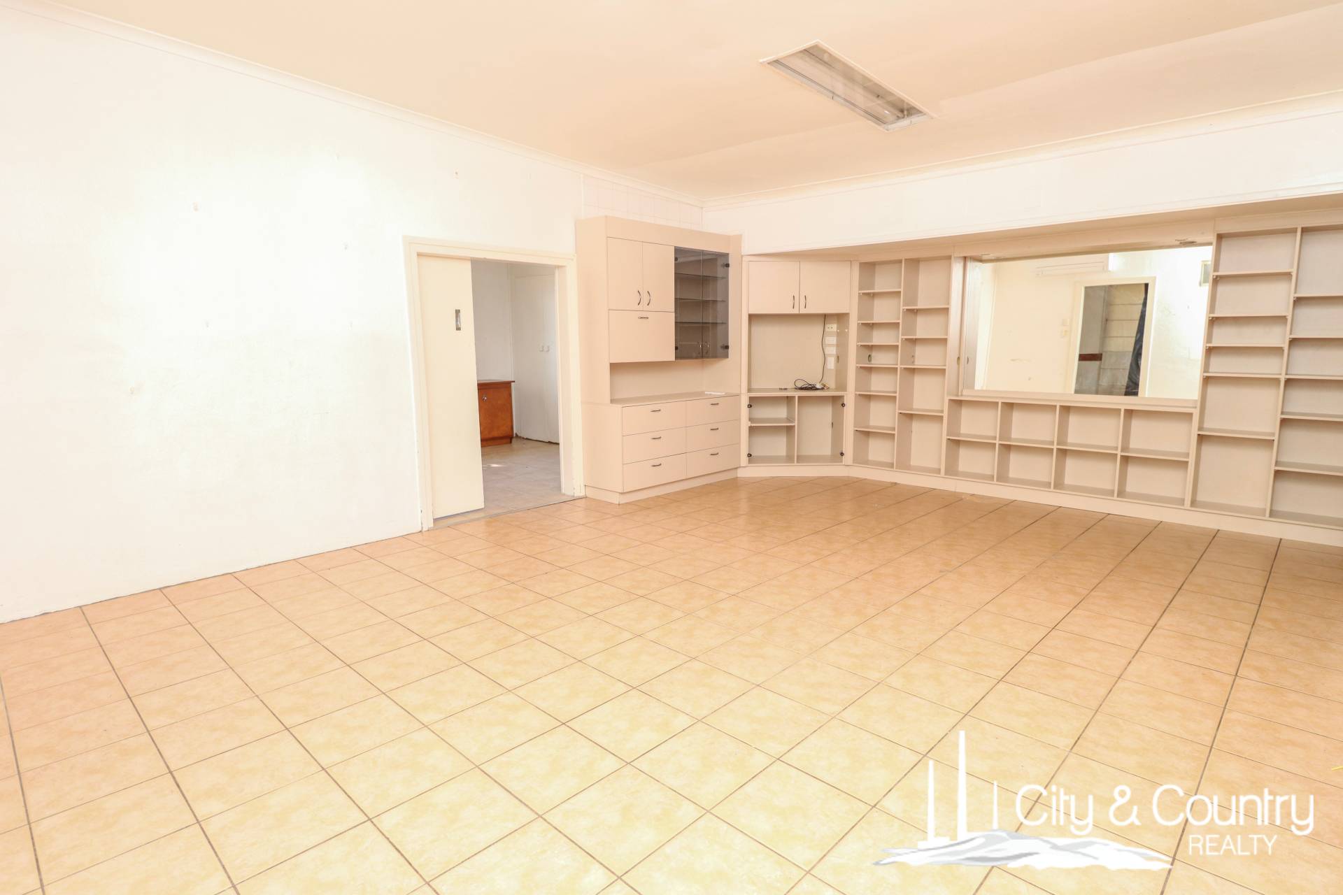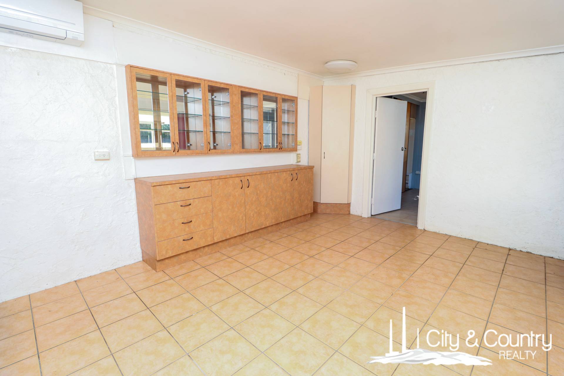 Step through the tiled entryway, cooled by a refrigerator-style air conditioner, into a large tiled lounge room complete with split system air conditioning and ample built-in storage. The adjacent separate dining room also features built-in cabinetry and its own split system, creating a flexible layout ideal for family living.