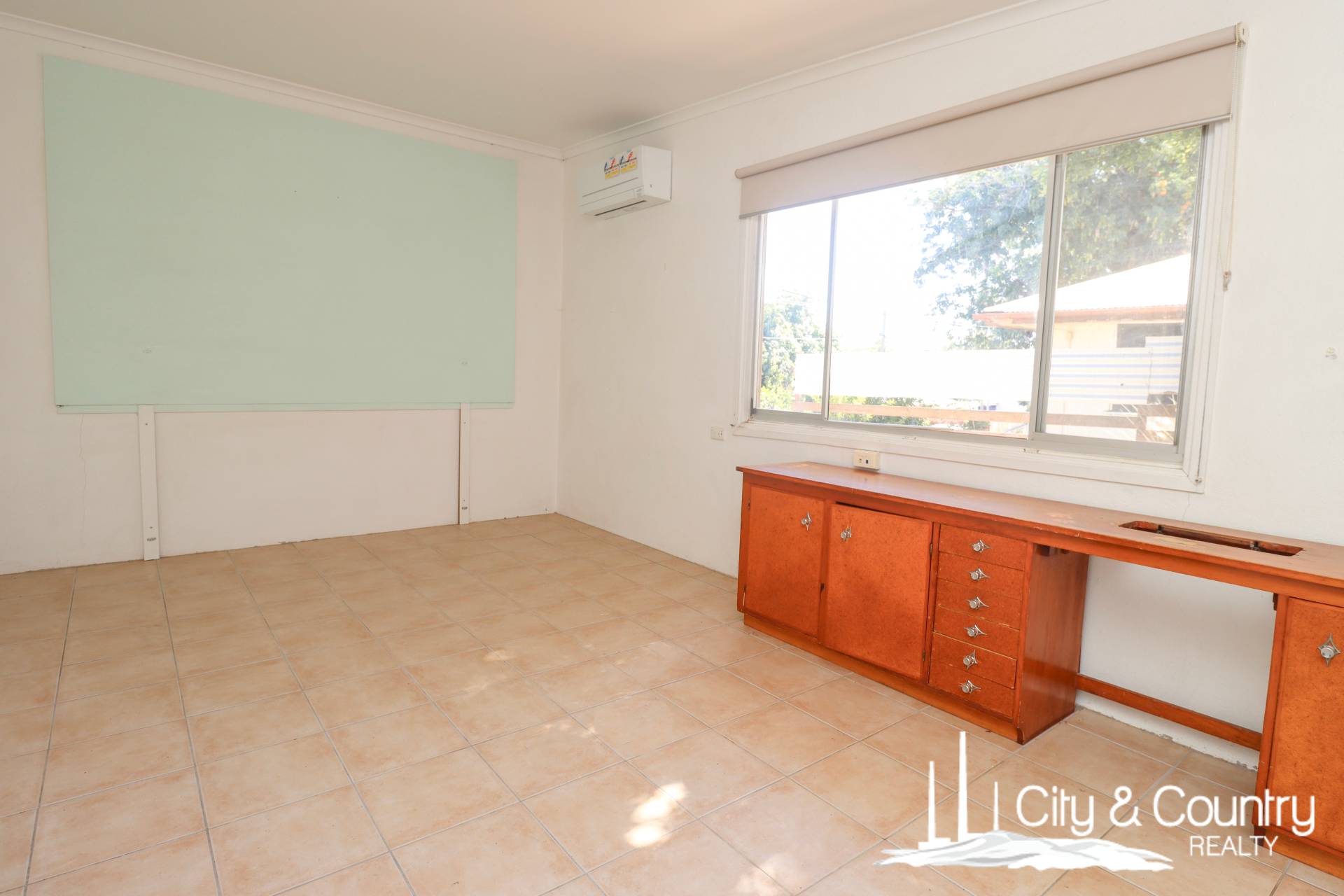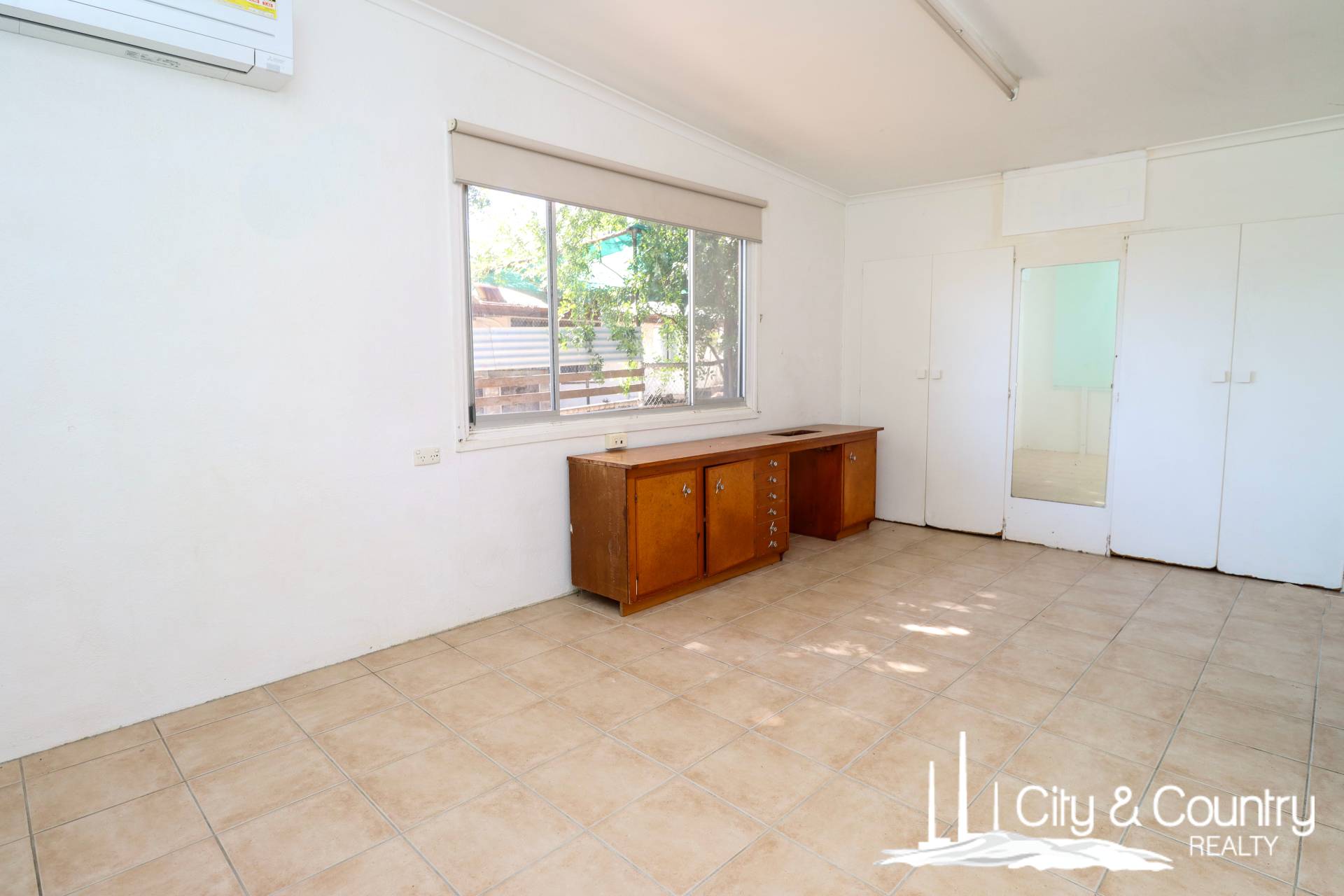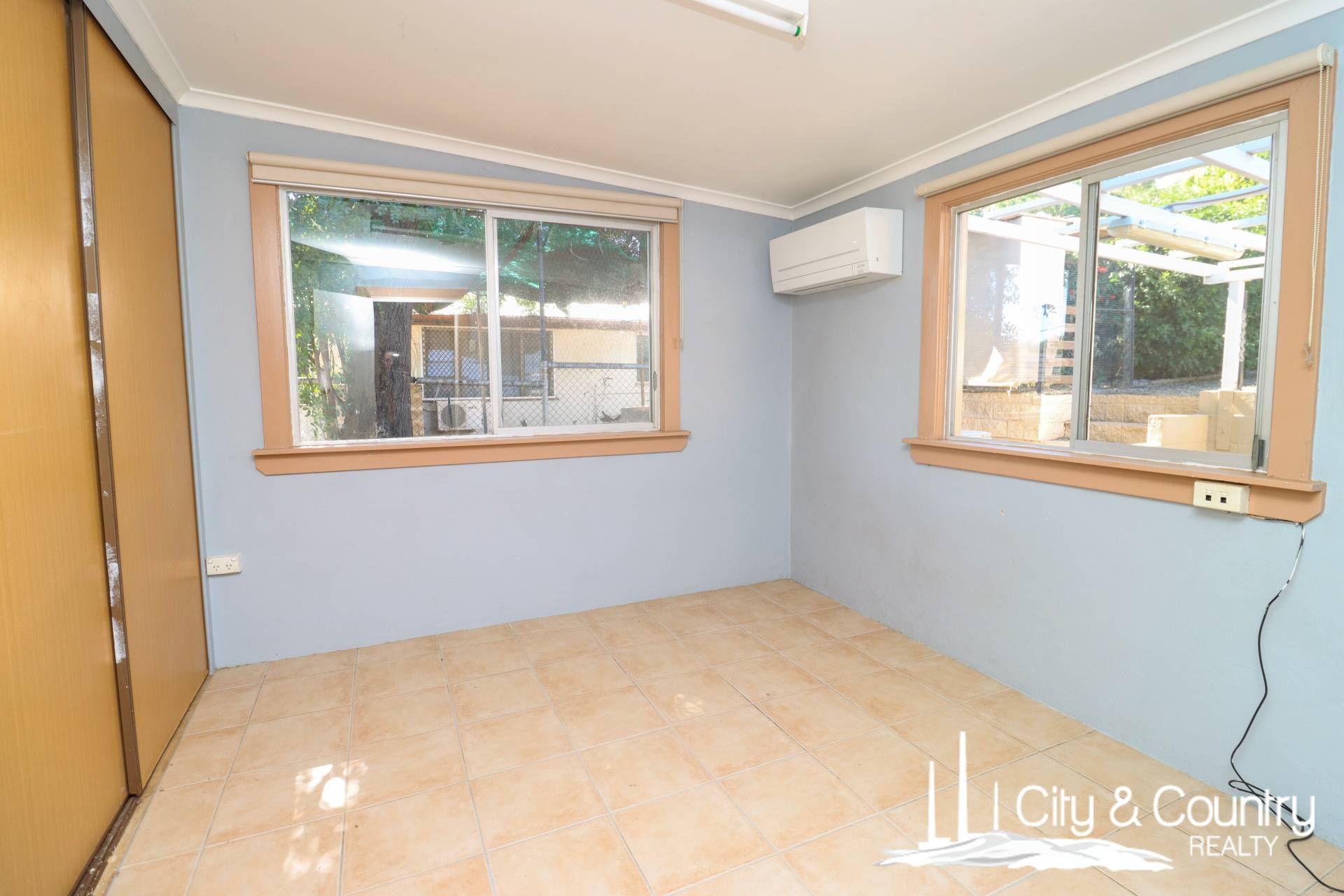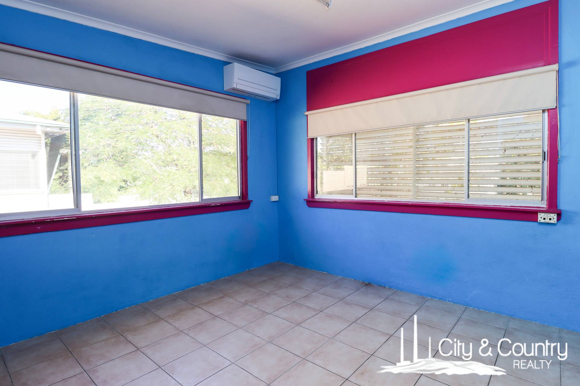 There are three bedrooms, all tiled and fitted with split system air conditioning, built-in wardrobes, and additional shelving. The main bedroom includes an extra-large built-in robe, while the second bedroom bursts with colour and charm. The bathroom includes a shower-over-tub and a combined toilet, ready for a modern refresh.
