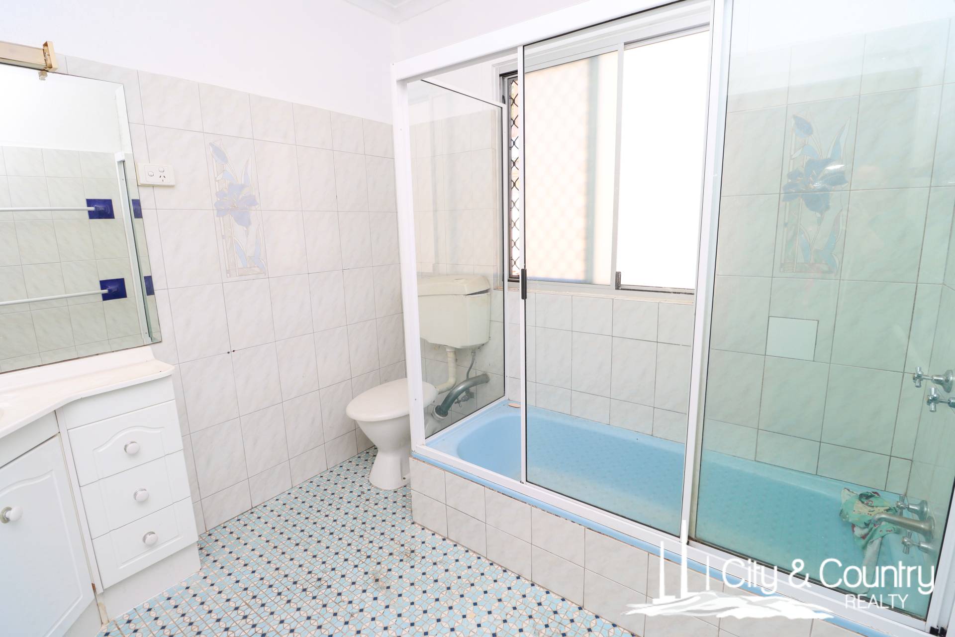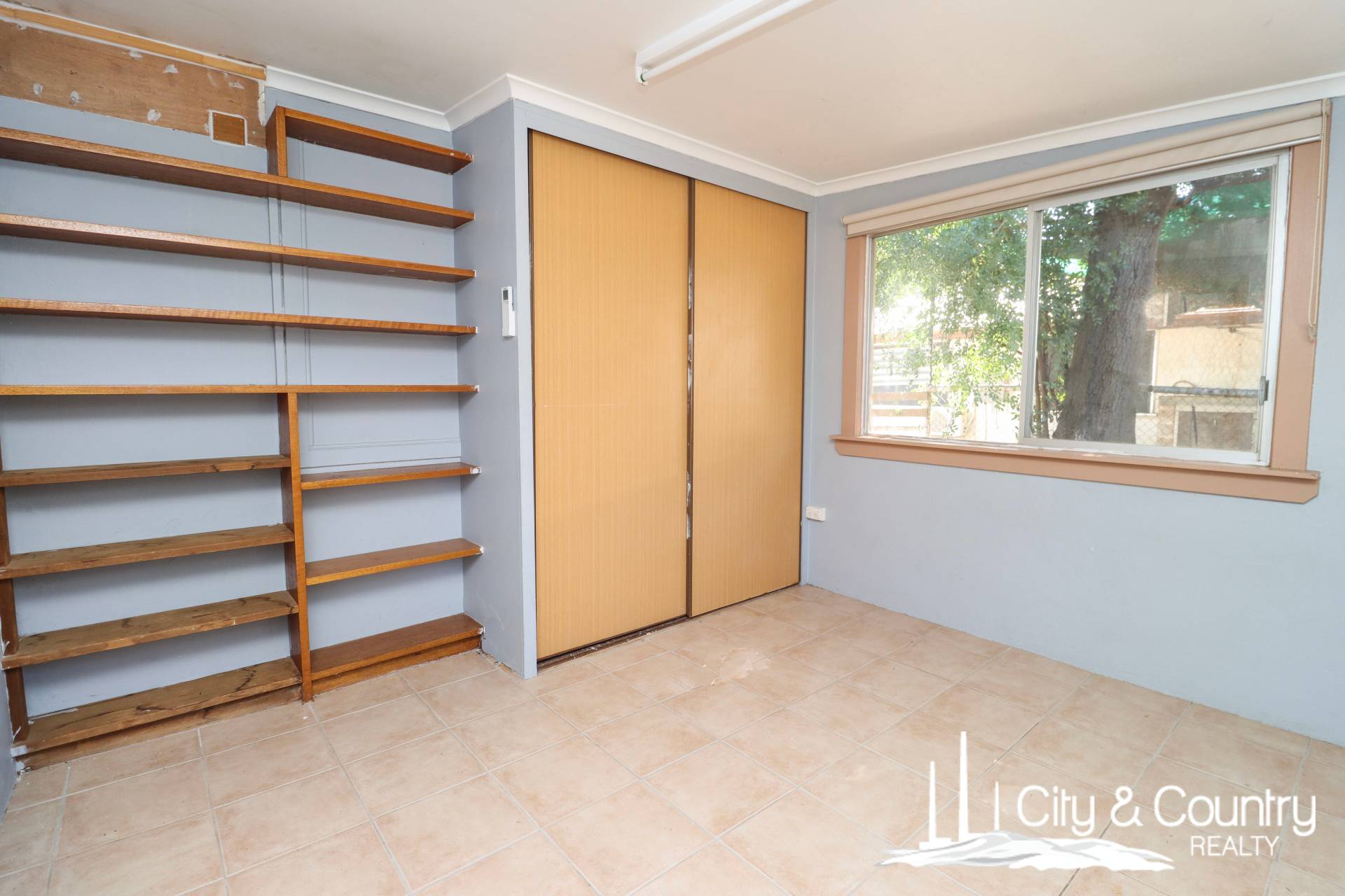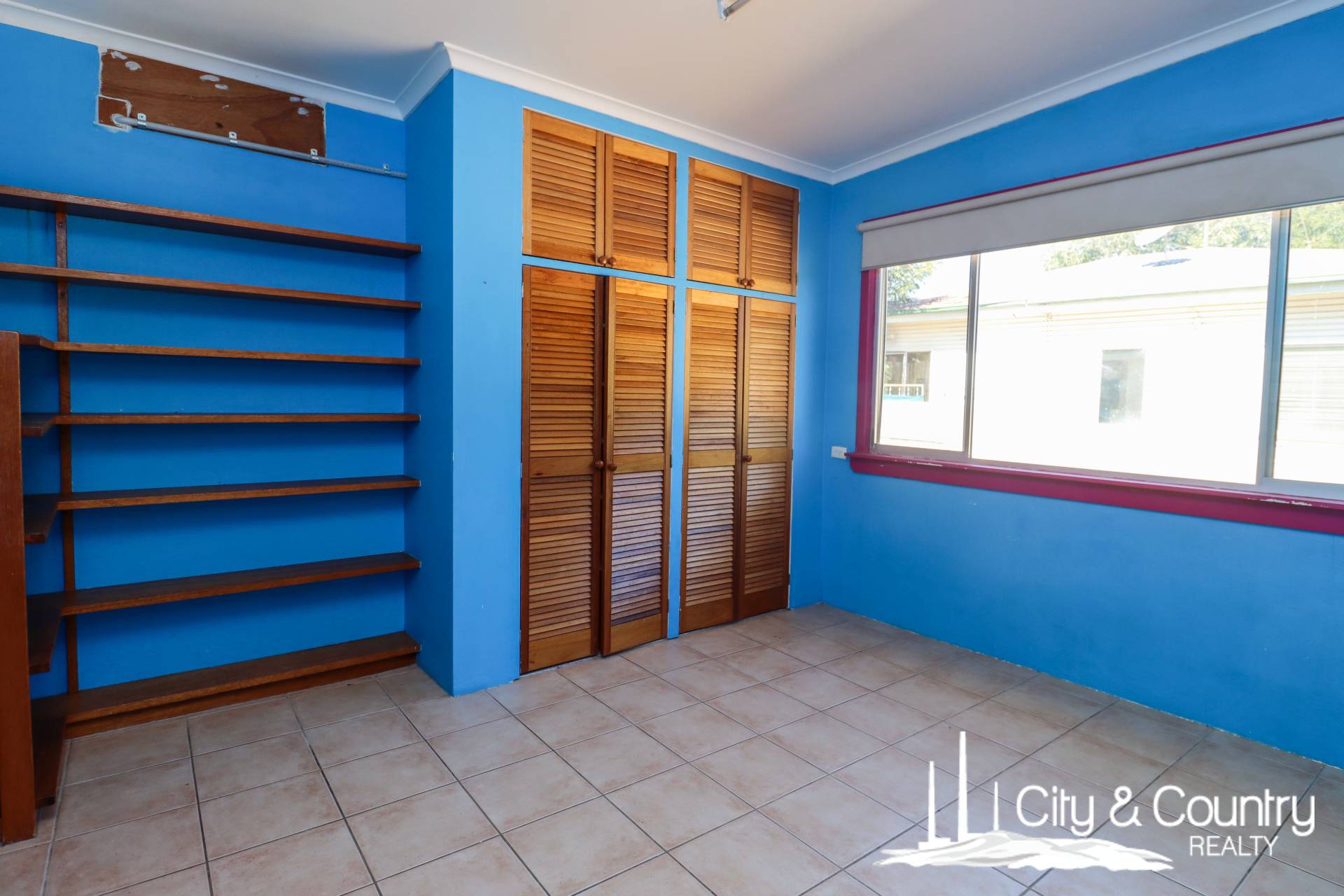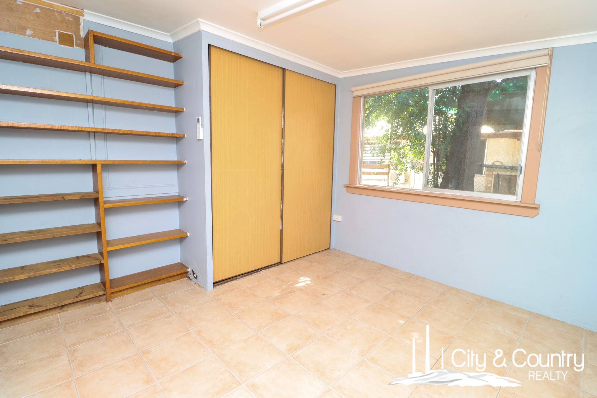 There are three bedrooms, all tiled and fitted with split system air conditioning, built-in wardrobes, and additional shelving. The main bedroom includes an extra-large built-in robe, while the second bedroom bursts with colour and charm. The bathroom includes a shower-over-tub and a combined toilet, ready for a modern refresh.