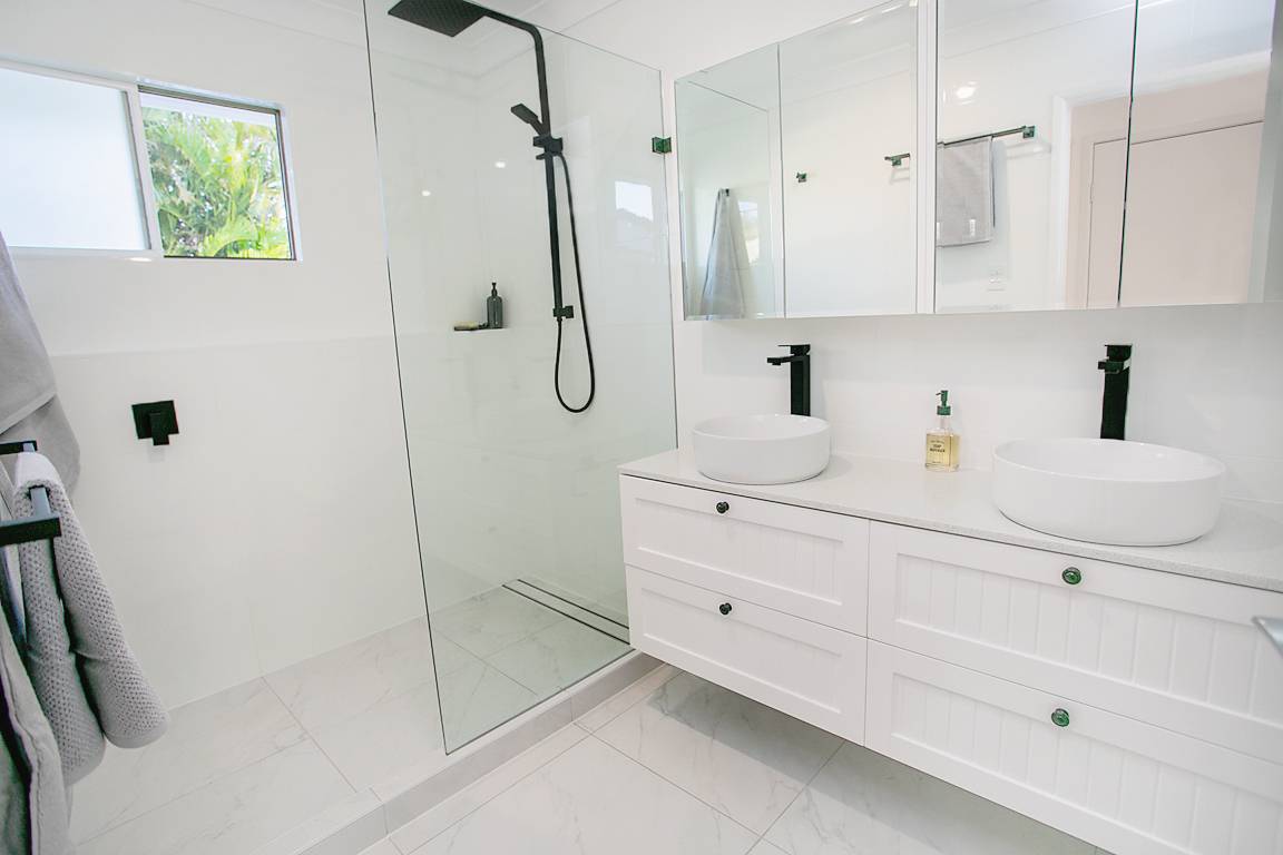 The kitchen is a true standout, offering a sleek monochromatic design with premium finishes. Features include stone benchtops, an island bench, Bosch pyrolytic induction oven, range hood, deep drawers, and extensive storage—perfectly suited to both everyday living and entertaining. The designer bathroom continues the luxury theme, complete with a double vanity and dual sinks, stone benchtop, black tapware, dual mirrored shaving cabinets, an oversized shower with rainwater shower head, and full-length shelving. A separate toilet adds further convenience.